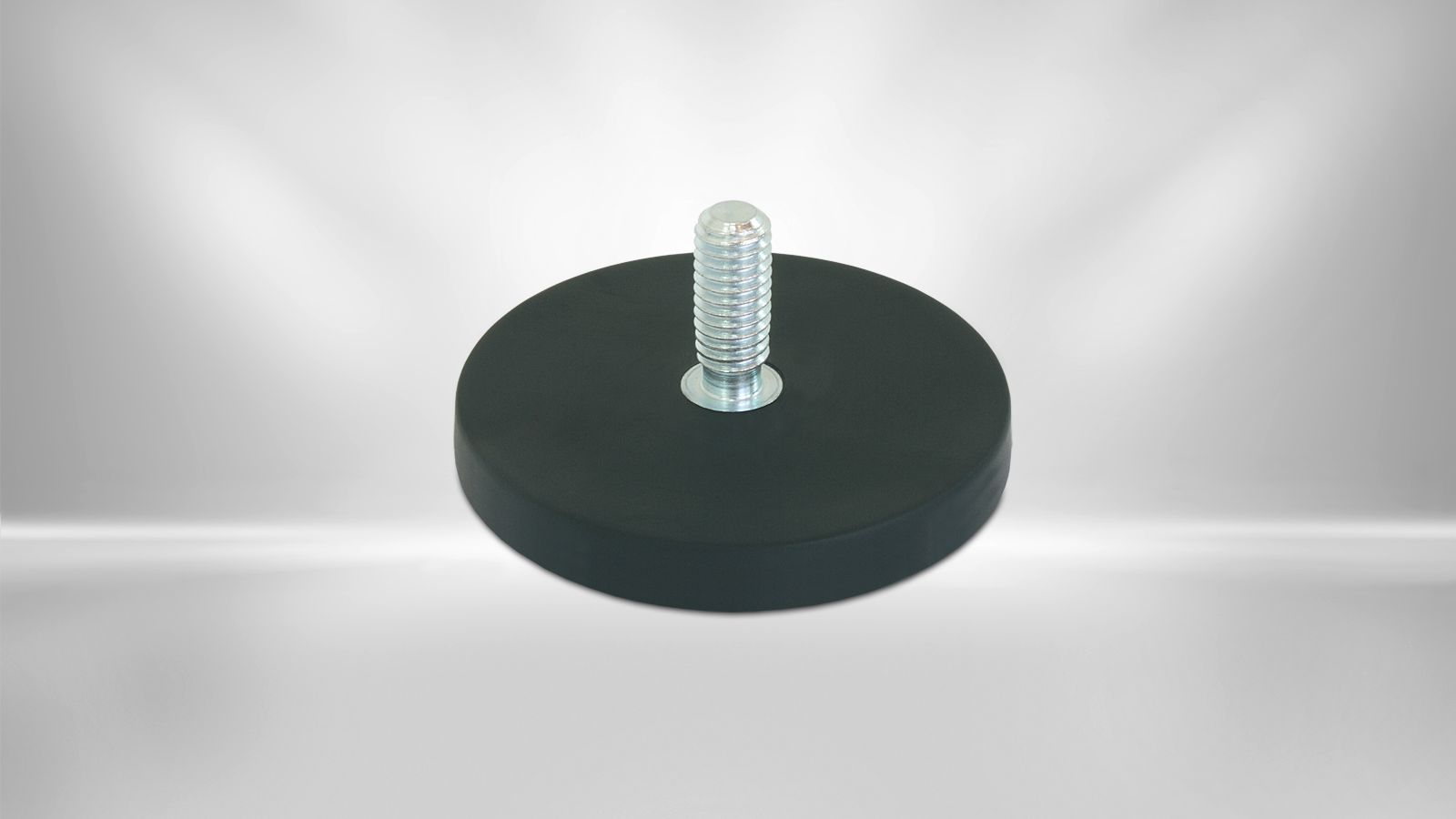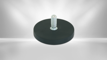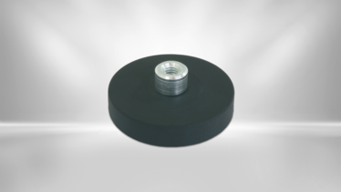Flachgreifer mit einem Neodym Magnet im gummiummantelten Stahltopf. Das Gehäuse verstärkt die Haftkraft des Permanentmagnet. Die maximale Haftkraft wird erreicht bei vollflächiger Auflage auf einem metallischen Untergrund. Der Flachgreifer hat eine Gewindezapfen mit Außengewinde.
