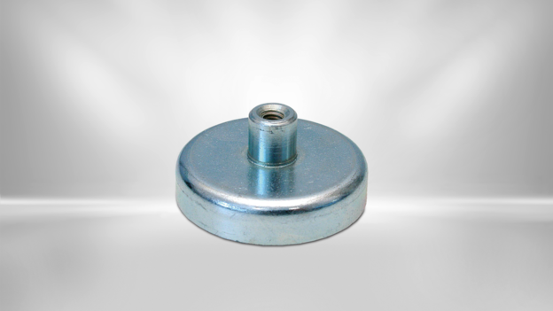Flat gripper with a neodymium magnet in a steel pot. The housing increases the adhesive force of the permanent magnet. The maximum adhesive force is achieved when the entire surface is placed on a metallic surface. The flat gripper has a threaded socket with an internal thread.