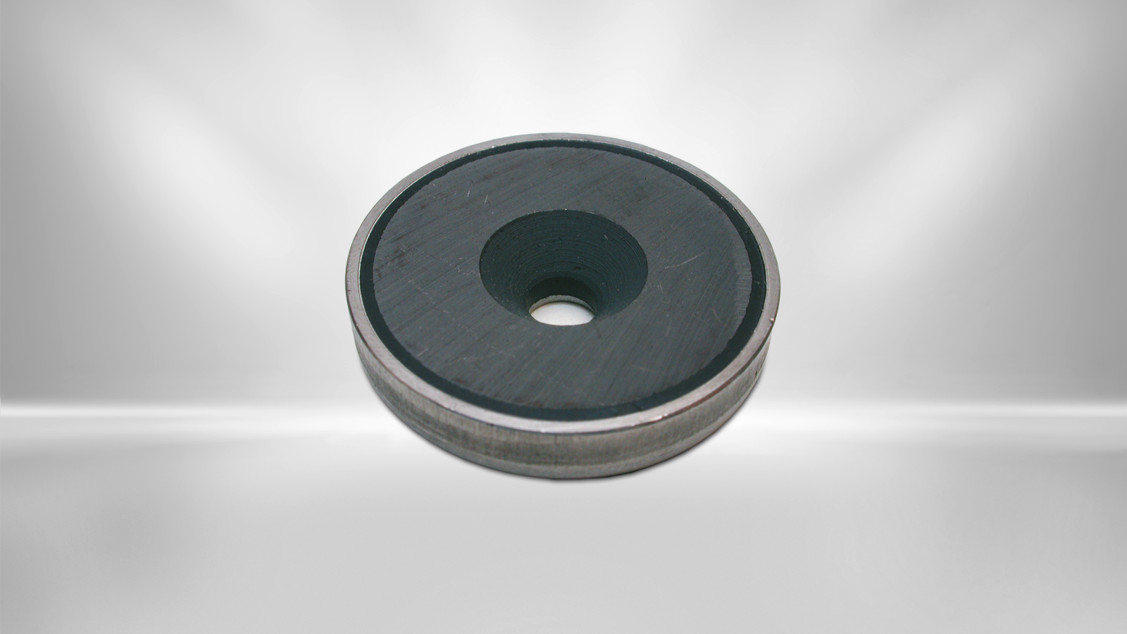 Flat gripper with a hard ferrite magnet in a stainless steel pot. The housing increases the adhesive force of the permanent magnet. The maximum adhesive force is achieved when the entire surface is placed on a metallic surface. The flat gripper has a bore and countersink and can be screwed on with a countersunk screw.