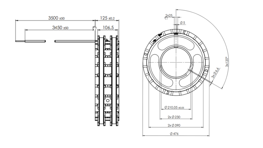 The round inductor heats rollers with an internal diameter of 480 mm. Several inductors can be mounted on a carrier tube. The modular approach allows different roller widths to be heated. In addition, it enables individual heating of individual roller areas, which enables particularly homogeneous surface temperatures. Due to the high efficiency of the induction systems of approx. 98% of the electrical energy is converted into heat very efficiently.